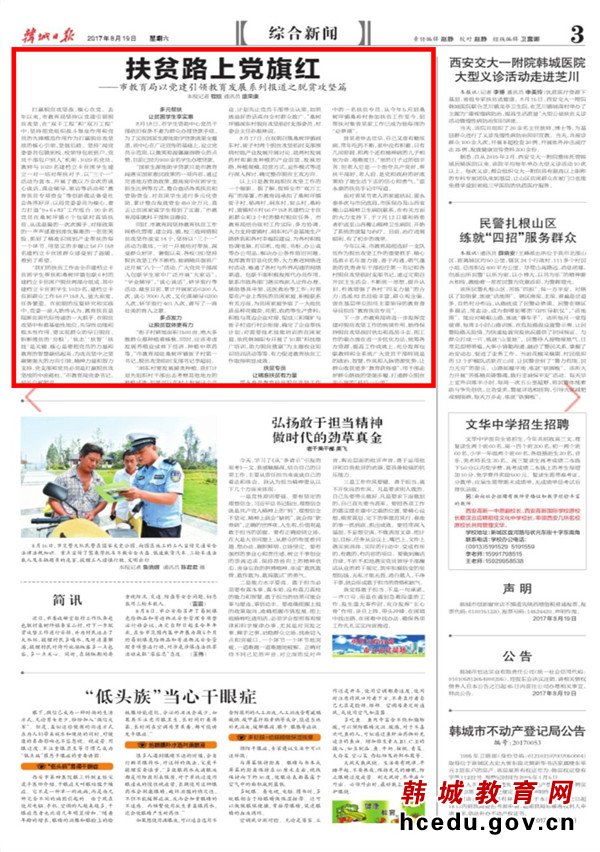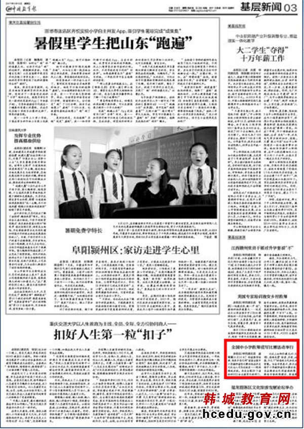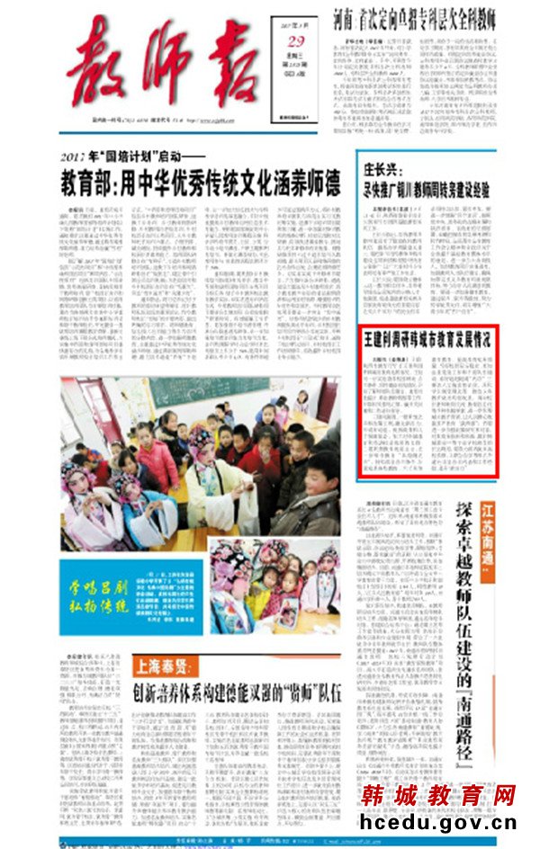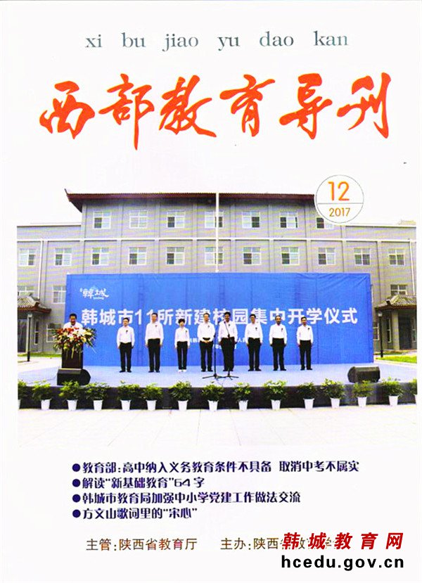 二是选题策划亮点纷呈。结合全局工作重点,策划完成了“党建引领教育发展”六期系列宣传,突出党建引领,以“党建+”教育质量、作风建设、脱贫攻坚、干部管理、项目建设、研学旅行为重点,从不同角度展示了一年来党建引领推动各项工作的思路、做法和成效,“党建引领教育发展”成为全市基层党建工作的特色和亮点。策划完成了《西部教育导刊》12月份专刊,展示了近年来韩城教育在党建、德育、脱贫攻坚、基础教育改革、素质教育工作等方面凝练的新思路、取得的新业绩和广大师生良好的精神风貌。策划完成了深化“三项机制”专题宣传、“五城联创”专题宣传、脱贫攻坚专题宣传、教育质量提升专题宣传,作风建设专题宣传等重点工作的跟踪和阶段性重点宣传报道,推动工作创新影响力不断扩大,得到省教育厅官网和《陕西教育》等的广泛关注。