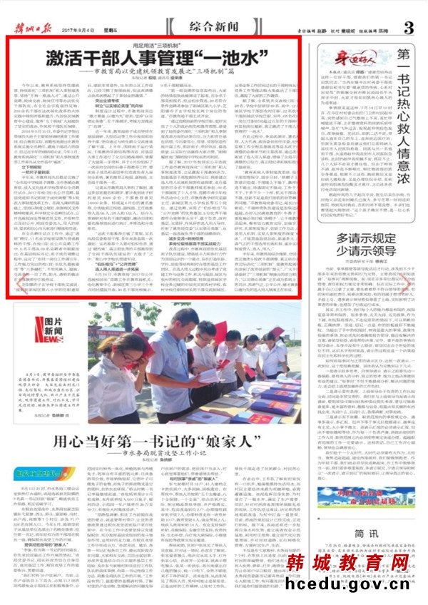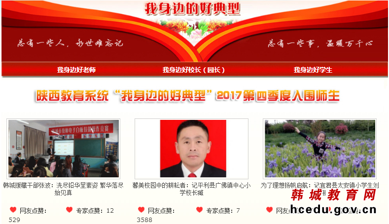 一是重点宣传有声有色。抢抓节点、唱响主旋,十九大期间按照全省教育系统安排和教育工作实际,策划完成六期专题宣传,展现了教育系统干部师生学习十九大、一心跟党走的精神风貌;统筹发力、系统发力,精心策划重点工作、重大活动的宣传工作,多维度展示系统上校决策、推动、创新全省教育系统和全市重点工作的新举措,2017年全系统作风建设推进会、中小学校长竞聘上岗,“走进史圣故里·体验黄河文化”万人研学旅行韩城盛装起幕、首届全国中小学教师读写大赛启动活动、2017年全省教育系统信息工作培训会、2017年全市11所园校集中开学仪式、问责质量和食品安全工作不优校(园)长等工作在社会各界引发广泛影响;着眼细小、温暖如初,主动挖掘和提炼全系统的典型人物事迹,象山中学“全国文明校园”、新城区第五小学“国家防震减灾演练示范校”、新城区第三小学“全国巾帼文明示范岗”“陕西省美德少年”——西庄镇东庄中学孙妍,渭南市“五一巾帼标兵”——韩城职专附属幼儿园牛育贤,韩城市“三八红旗手”——新城区第一幼儿园蔺丽丽,韩城市“五四青年奖章”获得者芝阳镇乔子玄学校樊能栋,市电化教育中心援藏干部张波,金城区陈家巷小学、新城区新城幼儿园支教教师卜育森、段建芳,教育扶贫专员孙旭升等一批在平凡岗位上默默奉献,在追赶超越火热实践中做出做出突出贡献的先进集体和先进个人,极大鼓舞了基层干部师生的精气神。